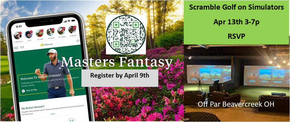 On Sunday, Apr 13th at Off Par Golf & Social from 3-7pm, we are hosting a two person team scramble at the simulator in Beavercreek OH. $25 per player. Team of 2 players. Cash bar. Play and watch the Masters leader Board complete the exciting Masters tournament. Registration required. See link at top of this website.