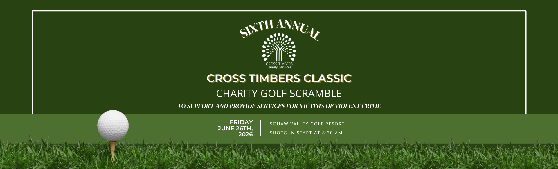 Early bird registration is OPEN for the SIXTH ANNUAL Cross Timbers Classic! Register now to lock in early bird pricing and reserve your spot or sponsorship for next year’s tournament at this year’s rate! Registration includes breakfast, lunch, a complimentary bloody mary, green-fees, and cart rentals. Join us on Friday June 26th, 2026 at Squaw Valley Golf Club for 18 holes of golf, all for a worthy cause.